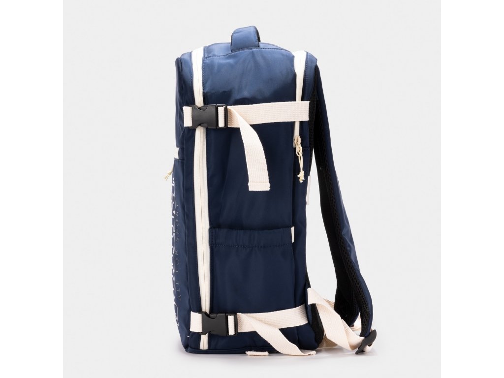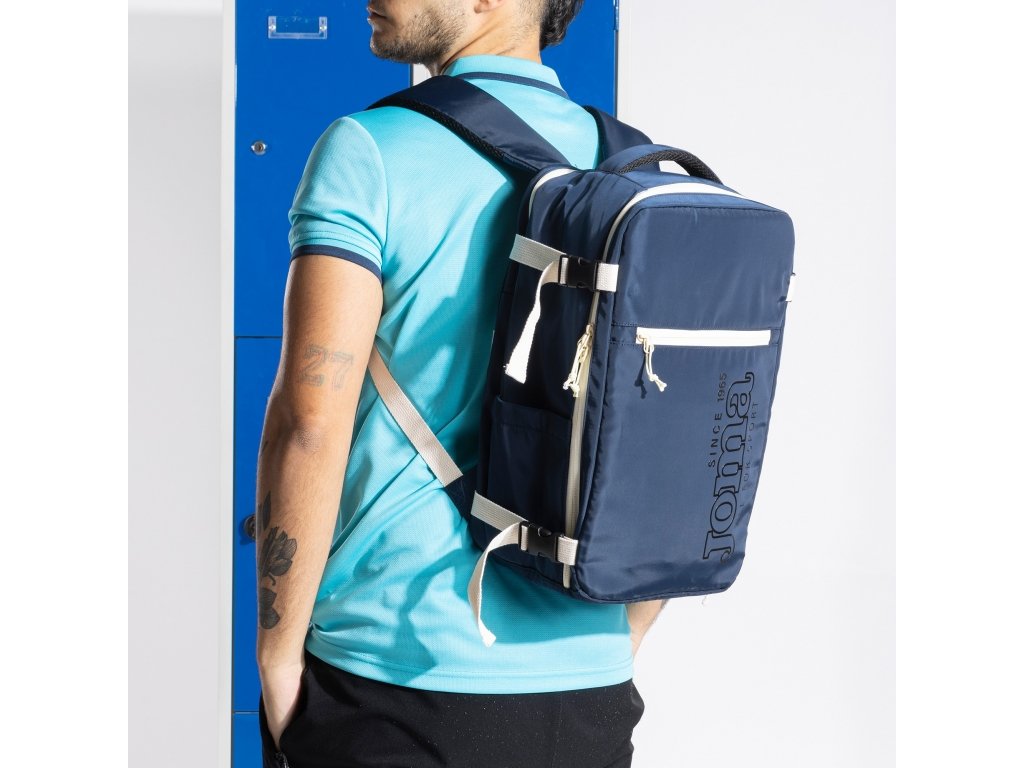 Obsahuje rukojeti vybavené elastickou páskou a nastavovačem pro přizpůsobení na míru, zatímco boční elastická páska a vnitřní síťovaná kapsa usnadňují organizaci vašich věcí. Zahrnuje speciální přihrádku na boty s elastickou páskou pro dokonalé přizpůsobení a elastickými popruhy podobnými těm u kufrů, aby vše zůstalo na svém místě. Navíc je vybaven vnější kapsou na zip pro rychlý přístup k drobným předmětům.